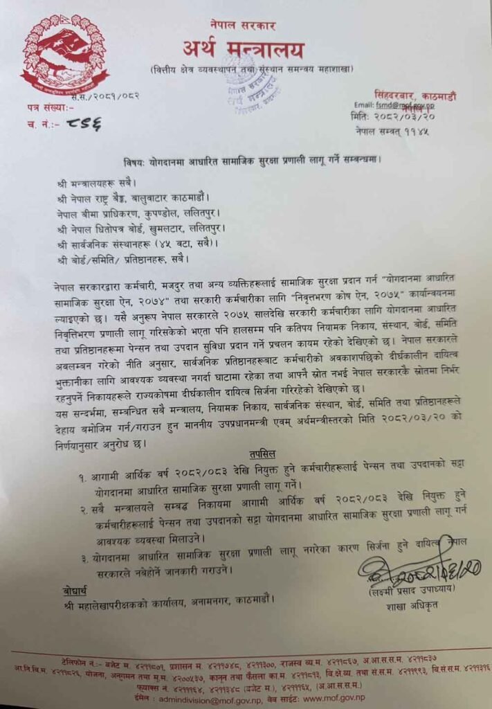 काठमाडौं । आर्थिक वर्ष २०८२/०८३ देखि नियुक्त हुने कर्मचारीहरुलाई पेन्सन तथा उपदानको सट्टा योगदानमा आधारित सामाजिक सुरक्षा प्रणाली लागू हुने भएको छ ।