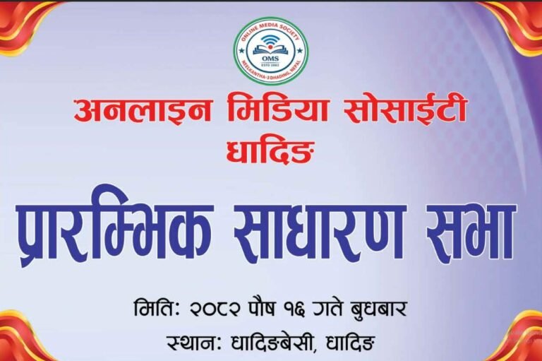 धादिङ । धादिङ जिल्लालाई कार्यक्षेत्र बनाएर सञ्चालन भइरहेका अनलाइन सञ्चारमाध्यमका सञ्चालकहरू एकजुट भई अनलाइन मिडियाको व्यावसायिक हकहित संरक्षण र प्रवर्द्धनका लागि ‘अनलाइन मिडिया सोसाइटी धादिङ’ गठन गरिएको छ। जिल्लामा क्रियाशील अनलाइन मिडियालाई संस्थागत, उत्तरदायी र मर्यादित बनाउँदै पत्रकारिताको विश्वसनीयता अभिवृद्धि गर्ने उद्देश्यका साथ सोसाइटी स्थापना गरिएको हो।
