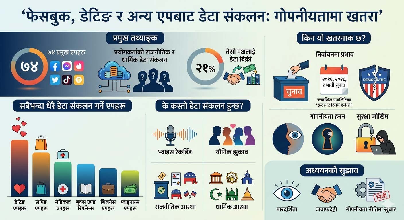 काठमाडौं-फेसबुक, म्यासेन्जर, टिन्डर र बम्बलजस्ता विश्वका सर्वाधिक लोकप्रिय ७४ वटा एपहरूले प्रयोगकर्ताको राजनीतिक एवं धार्मिक आस्थासम्बन्धी संवेदनशील डेटा संकलन गर्ने गरेको एक अध्ययनले पुष्टि गरेको छ। डेटा सुरक्षाको क्षेत्रमा काम गर्ने संस्था इन्कग्निटोले गरेको अध्ययनअनुसार, यसरी संकलन गरिएका डेटामध्ये २१ प्रतिशत विवरण ती एपहरूले तेस्रो पक्ष (थर्ड पार्टी) लाई बिक्री गर्ने गरेका छन्।