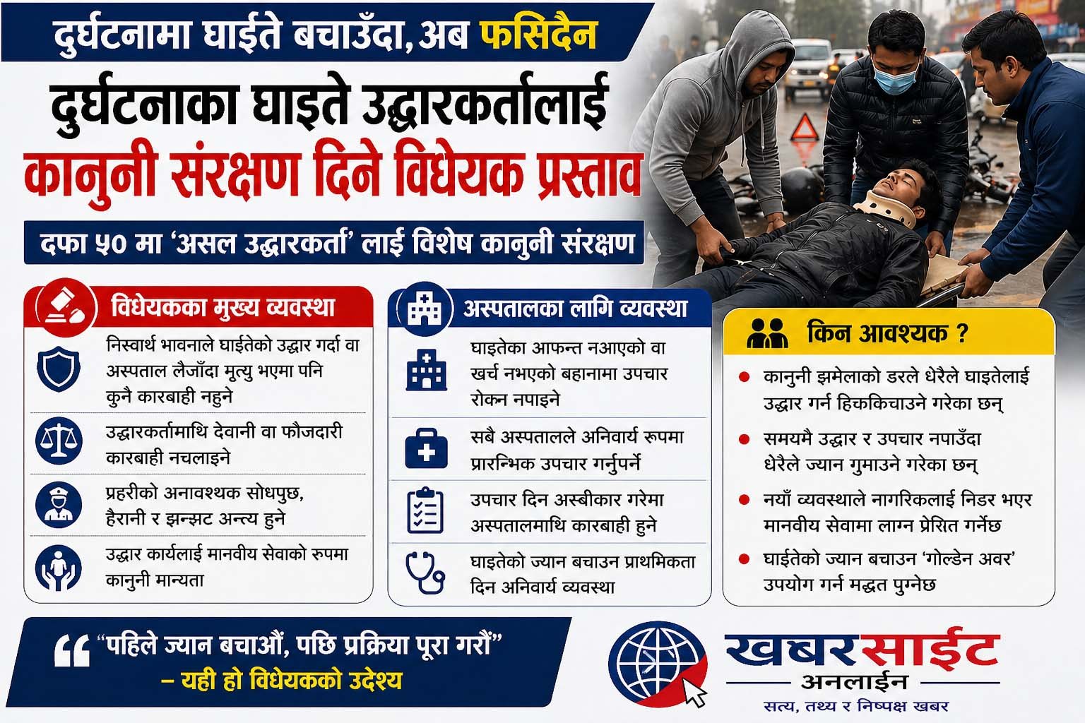 काठमाडौँ । सडक दुर्घटनामा घाइतेलाई उद्धार गर्दा कानुनी झमेला र प्रहरीको अनावश्यक सोधपुछ झेल्नुपर्ने डरलाई अन्त्य गर्न सरकारले नयाँ विधेयक प्रस्ताव गरेको छ। प्रस्तावित विधेयकमा ‘असल उद्धारकर्ता’ लाई विशेष कानुनी संरक्षण दिने व्यवस्था गरिएको छ।